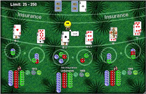 BlackJack three players against bank - The rules are chooseable: Las Vegas, Trasure Island, Atlantic City, German casinos or self defined rules. You decide! |